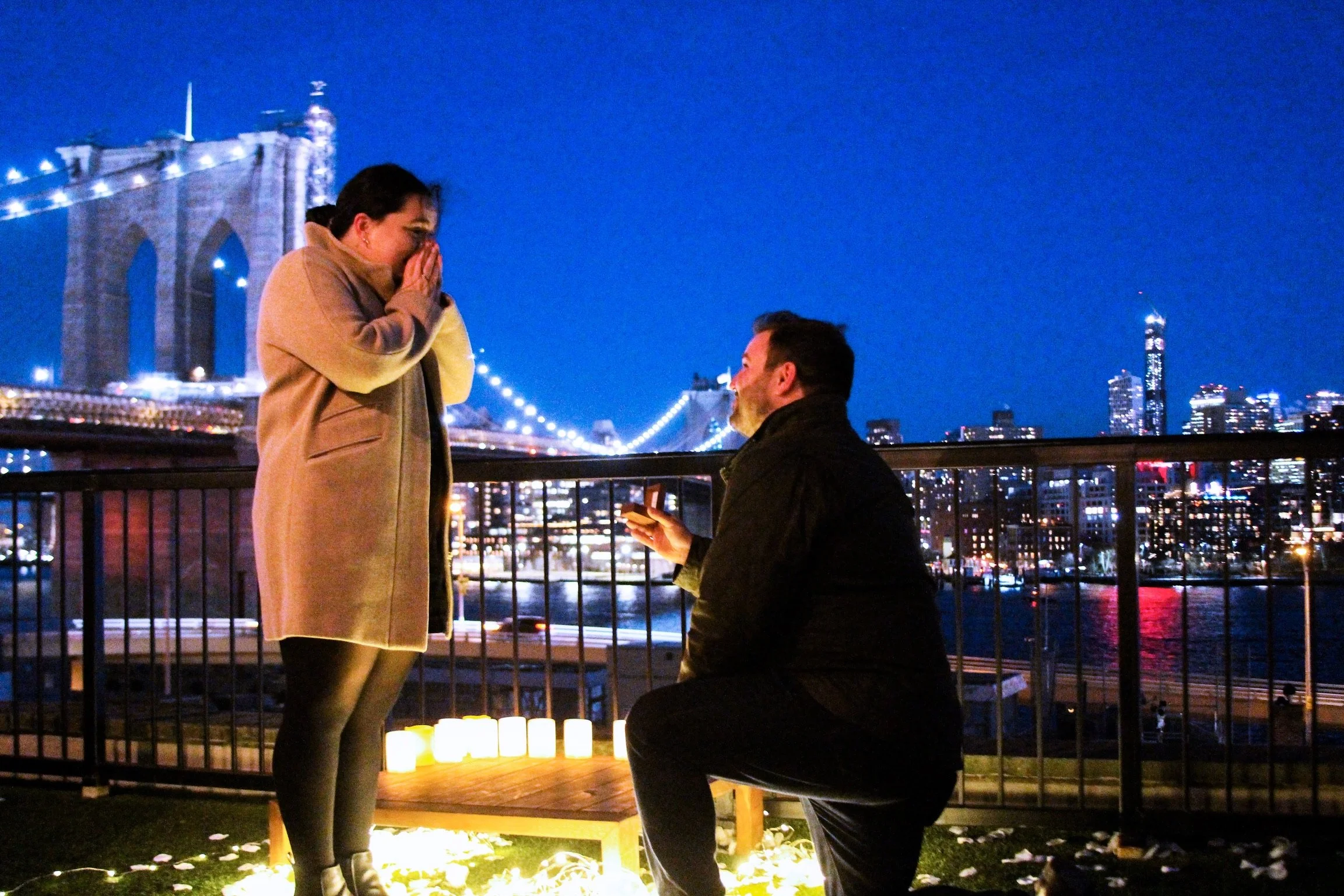 He popped the question in front of the Brooklyn Bridge